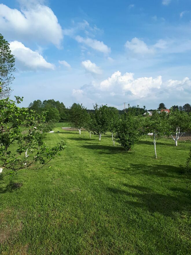 Po drugiej stronie drogi asfaltowej naprzeciwko działki wymienionej wyżej działka o pow. 4.300m2 na której stoi mały budynek gospodarczy z przeznaczeniem do przechowywania narzędzi gospodarczych. Na tej działce znajduję się sad owocowy, za sadem warzywniak, za warzywniakiem pastwisko – dużo zieleni.